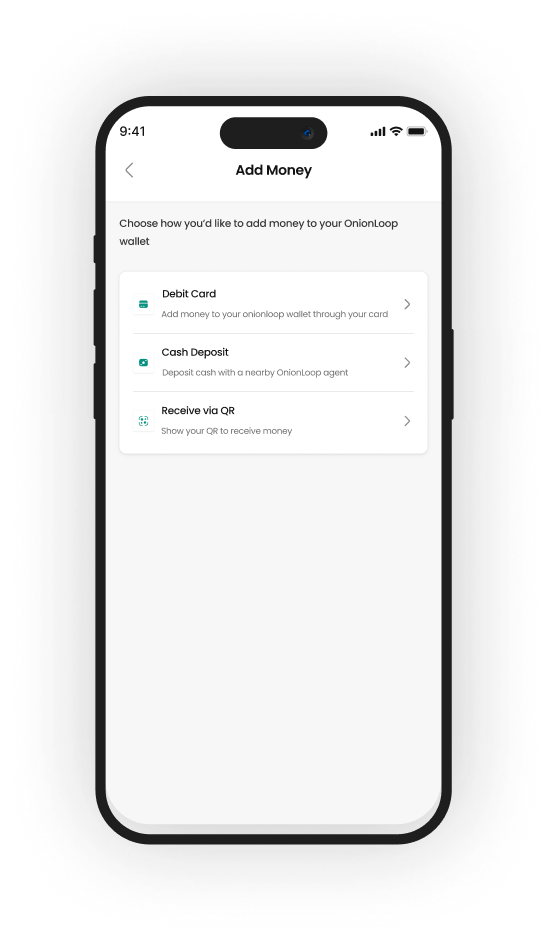 Deposit or withdraw cash through verified Onionloop agents. Your balance updates instantly, with every transaction securely protected.